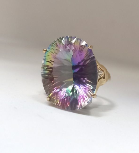 The natural diamonds on each side of the Mystic Topaz add a touch of elegance and balance to the design, creating a perfect blend of boldness and sophistication. This ring is definitely not for the faint-hearted and would make a great addition to any jewelry collection for someone who loves bold and colorful jewelry.