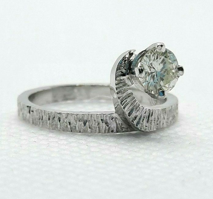 This handmade solitaire brilliant cut 0.38-carat diamond engagement ring, 18ct white gold is a luxurious piece for the perfect proposal. The band has a tree bark appearance with the diamond set on a twist. The one shining brilliant cut diamond sparkling on your finger you just won't need any other ornament. This is a ring to feel good about as well as to cherish forever.