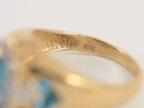 Here for sale we have this truly magnificent ladies ring, a central marquise cut stunning blue topaz stone with an eighteen stone brilliant cut diamond surround and a princess cut blue topaz set in each shoulder on a lovely 14K gold shank.