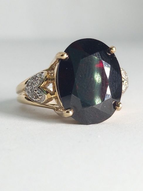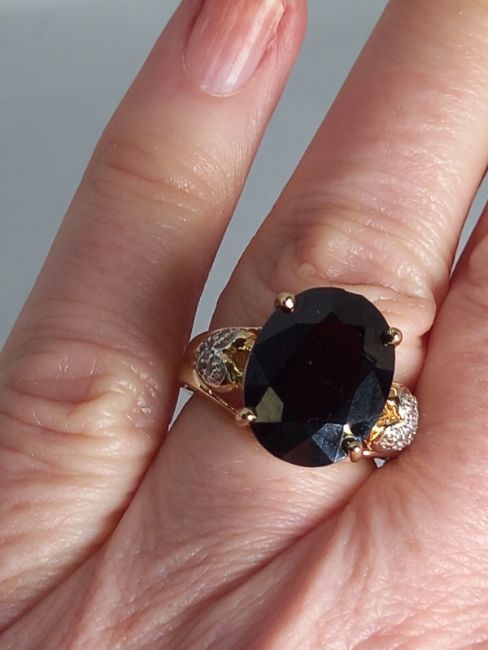 beautiful and elegant garnet ring! The prong setting is a classic style that allows the gemstone to be the focal point, and the ornate setting in yellow gold adds a touch of elegance to the design. The rich red/black colour of the garnet provides a striking contrast against the gold diamond-set band, and the scroll detailing on the gallery adds a sophisticated touch.