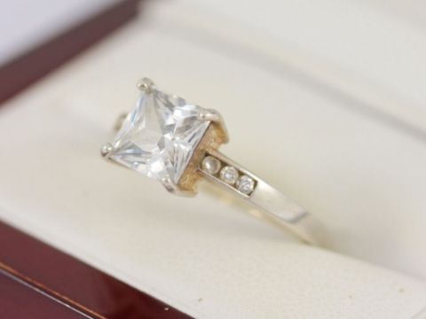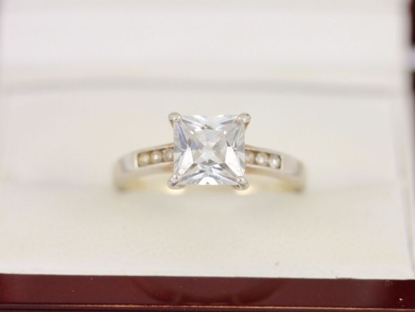Here for sale we have this beautiful ring, made from sterling silver with a gorgeous style and set with a princess cut CZ flanked by three cz stones channel set in either shoulder.