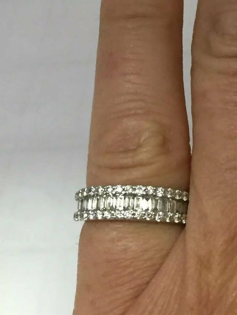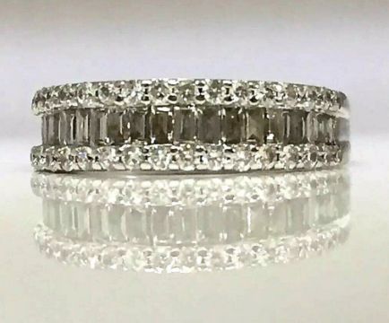 This stunning diamond Eternity ring has baguette diamonds running through the center of the band and round brilliant cut diamond around the edge.