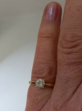 The definition of a timeless classic. A brilliant cut claw set diamond in a highly polished 18ct yellow gold band  reveals the centre stone in all its beauty.