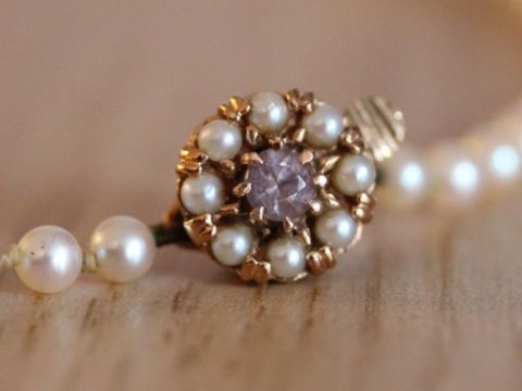 Here for sale we have this gorgeous ladies pearl necklace, featuring a 9ct gold clasp set with a beautiful amethyst surrounded by seed pearls.