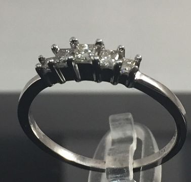 A gorgeous five stone diamond ring. The diamonds are princess cut in a claw setting, set on a plain white gold band.
