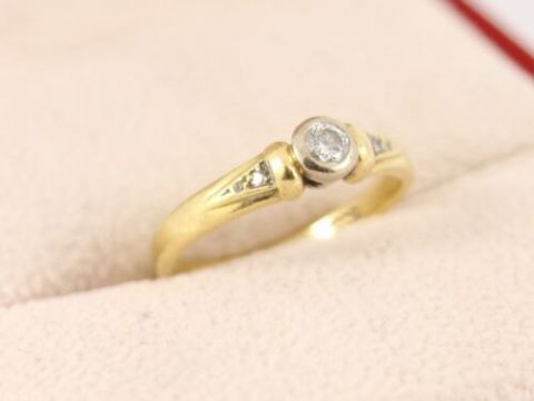 Here for sale we have this gorgeous ladies ring, a stunning brilliant cut diamond flanked by two smaller diamonds in either shoulder on a lovely 18ct yellow gold shank.