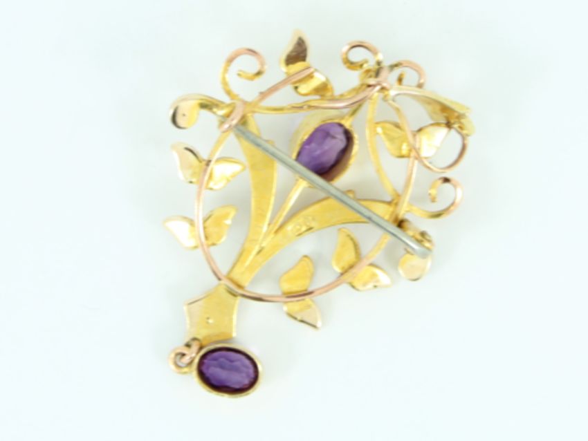 Here for sale, we have this magnificent vintage ladies brooch made from 9ct yellow gold and set with amethyst stones and seed pearls.