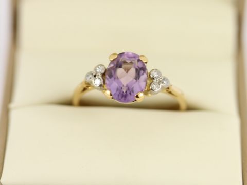 | Truly stunning ladies amethyst and diamond ring, the central oval facet cut amethyst flanked by three old cut diamonds on either shoulder on an 18ct shank. Size: N 1/2 Weight: 3.4 grams 0.06ct of diamonds Diamonds have been tested 100% authentic. |