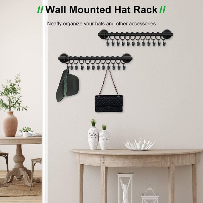 Hat Rack for Wall with 24 Hooks, Hat Organizer Holder for Baseball Caps, Cap Organizer Hanger, Hat Hanger for Closet, Black Hat Holder with Clips 2 Pack