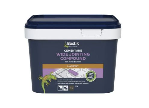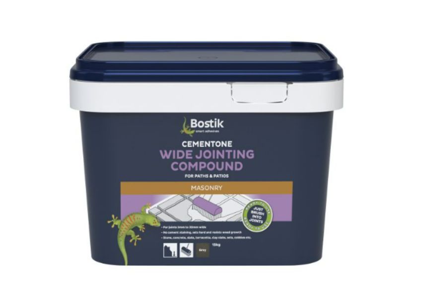Bostik Cementone Wide Jointing Compound for paths and patios forms a solid joint in domestic paving to resist weed growth and sand loss from power washing. The no-mix blend of polymers and sand binds on contact with air, making it is easier to use than traditional cement mortar.