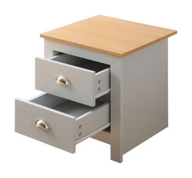 The Harmin Grey with Oak top Bedside is light Grey in colour with a Oak coloured Top. It is the perfect blend of a classic design with a modern feel and would suit almost any bedroom. This stylish and modern bedside has a Grey finish with an oak coloured top and brushed steel handles