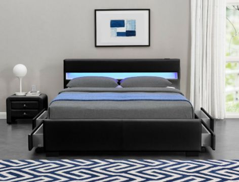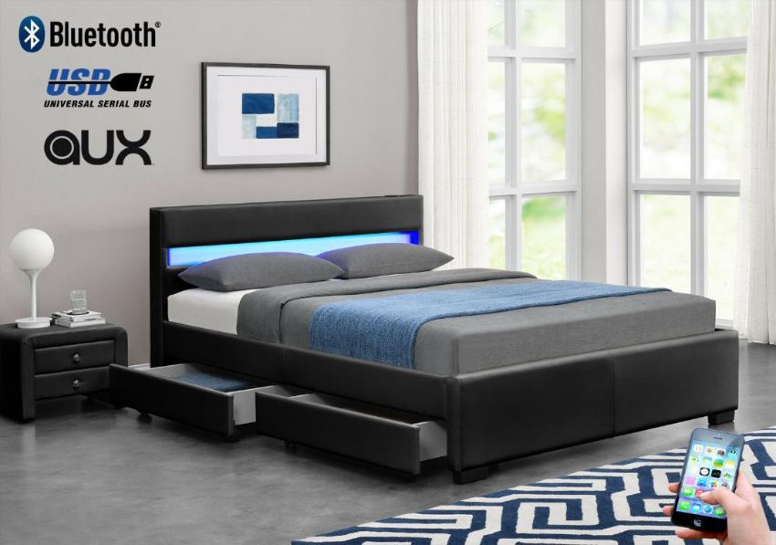 LED Colour Changing Lights in Headboard, Built in Speakers, USB Dock, Aux-in, Bluetooth, Remote control for LED lights, Touch Control for music, Built-in Under Bed Storage, Flat Pack, With Headboard, With Slats