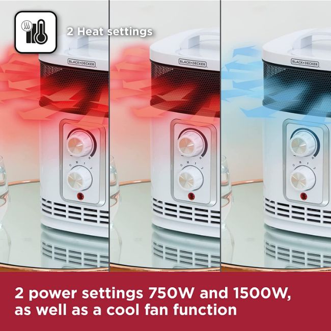 BLACK+DECKER Ceramic Fan Heater, 360° Heating, 2 Heat Setting, 1 Fan Setting, Adjustable Thermostat, 1.5KW, White