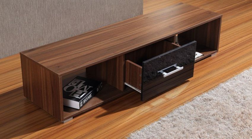 TV STAND has a Walnut Wood Effect frame with a High Gloss Black drawer front and premium metal handle and drawer runners