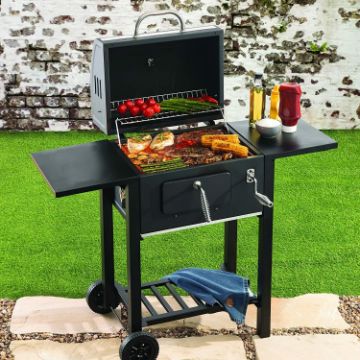 Hairy Bikers Charcoal Trolley Grill Barbecue With Warming Rack and Two Way Foldable Shelves, Temperature Gauge and Stainless Steel Handles with Removable Ash Tray, Two Airing Vents, Black, GDW1012Description: About this item