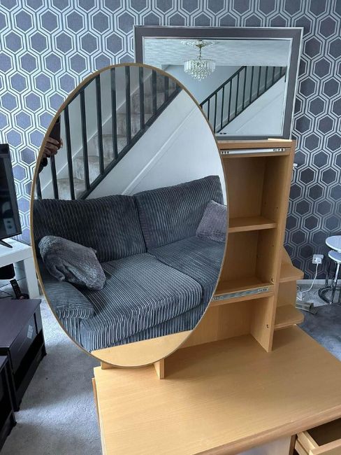 The mirror is on sliders and moves to either side. Has hidden storage behind the mirror as shown in photos