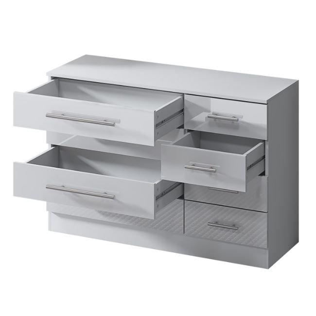 The 8 drawer chest is an excellent addition to our high gloss bedroom furniture range of stylish yet affordable furniture. The 8 drawer chest provides you with the storage space that a wardrobe cannot. The 8 sturdy individual drawers are in 2 columns of 4, one large the other small. They can take a remarkable amount of weight due to the high strength manufactured wood veneer frame. The drawers fit flush and are manufactured to strict conditions which mean they are stable and firm. With its clean simple design and rich high gloss finish, this set will blend in seamlessly with any modern or traditional bedroom. Manufactured from high grade chipboard with an authentic wood/matt effect finish to the carcass and luxury high gloss fronts (doors).