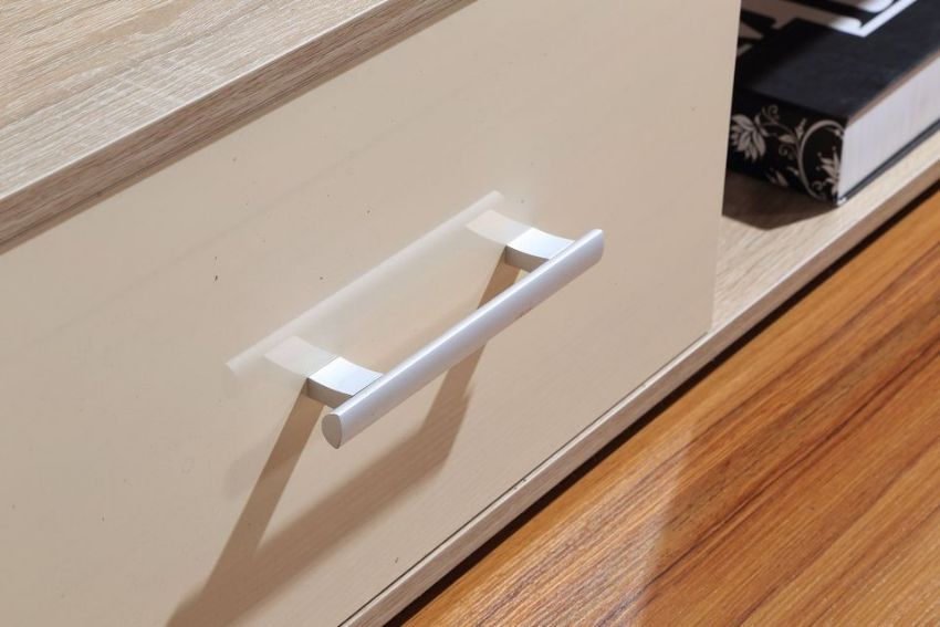 TV STAND HAS a Oak wood effect frame with a high gloss Cream drawer front, PREMIUM Metal handle and drawer runners