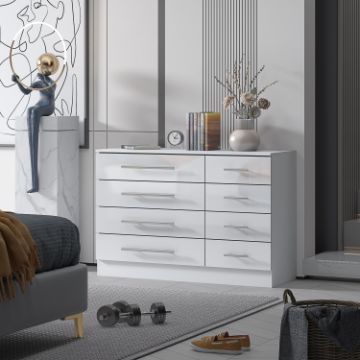 The 8 drawer chest is an excellent addition to our high gloss bedroom furniture range of stylish yet affordable furniture. The 8 drawer chest provides you with the storage space that a wardrobe cannot. The 8 sturdy individual drawers are in 2 columns of 4, one large the other small. They can take a remarkable amount of weight due to the high strength manufactured wood veneer frame. The drawers fit flush and are manufactured to strict conditions which mean they are stable and firm. With its clean simple design and rich high gloss finish, this set will blend in seamlessly with any modern or traditional bedroom. Manufactured from high grade chipboard with an authentic wood/matt effect finish to the carcass and luxury high gloss fronts (doors).
