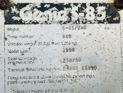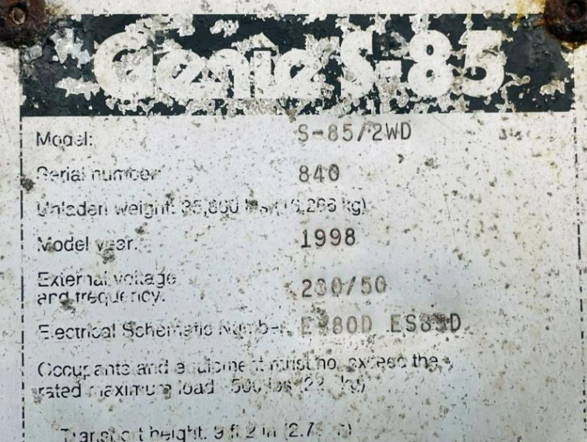 GENIE S85 AIREL PLATFORM * 85 FOOT WORKING HEIGHT * C/W HYDRAULIC PUSH OUT AXLES