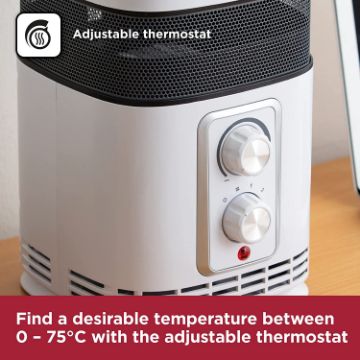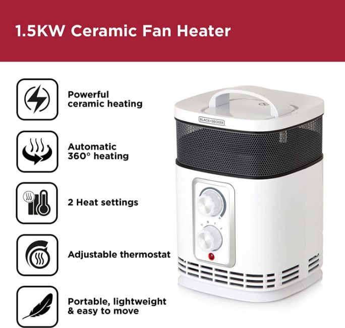 BLACK+DECKER Ceramic Fan Heater, 360° Heating, 2 Heat Setting, 1 Fan Setting, Adjustable Thermostat, 1.5KW, White