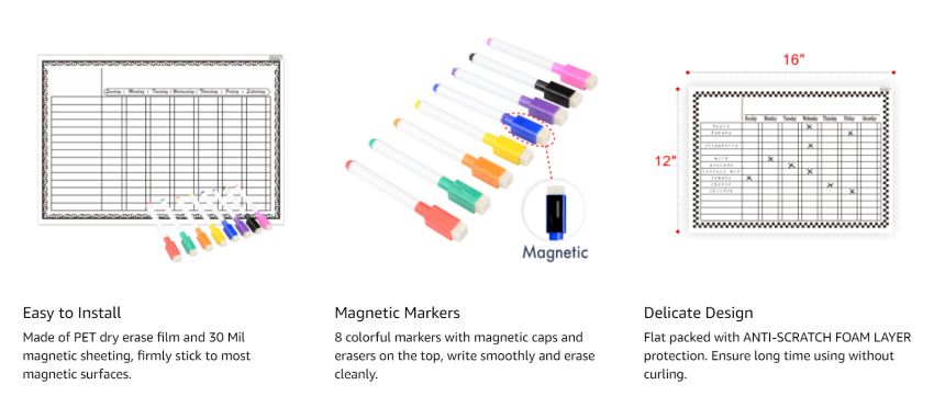 MULTI PURPOSE: 16" Wide × 12" Tall, Fits on any Magnetic Receptive surface like Kitchen Refrigerator, File Cabinet etc. Also works as sketch pad, message board and timetable.