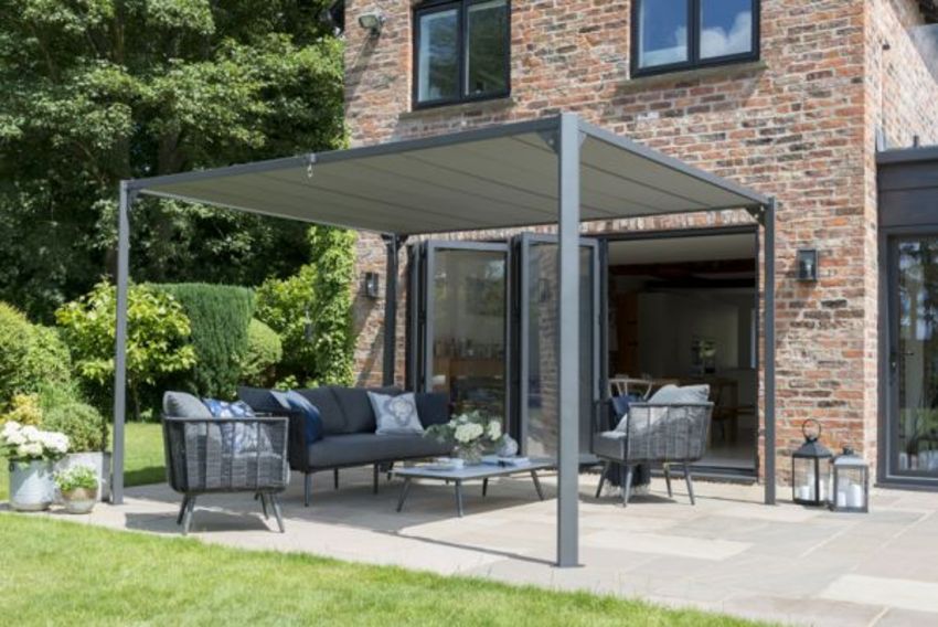 Experience the best of both worlds, with this 3 × 3.6m slatted roof pergola. Enjoy the sun or filter out quickly with the turn of a handle. Weather resistant textilene panels and an aluminium and steel frame.