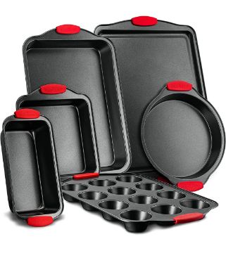 6-PIECE SET: The 6-Piece Baking Pan Set offers complete high quality kitchenware for baking cake, loaf, cookies, muffins, and more. Includes baking pan, round pan, square pan, loaf pan, big cookie sheet, and 12 cup muffin pan