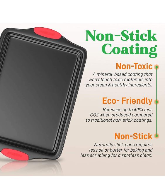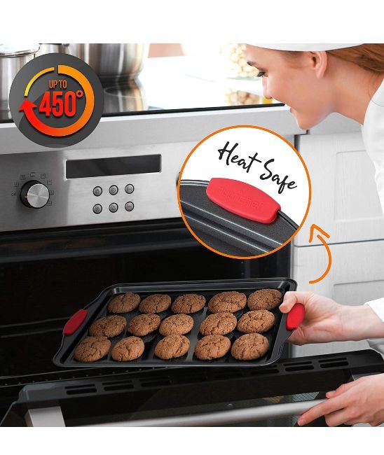 HANDLES THE HEAT: bold-colored, commercial-grade restaurant-quality metal bakeware provide a confident grasp while taking the baking pans out of the oven where they are oven safe to 446 degrees Fahrenheit