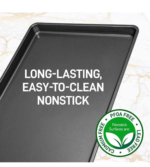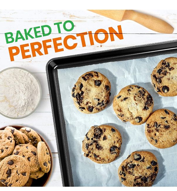 NON-STICK COATING: The large cooking sheet pan features a non-stick coated layer surface that ensures quick, effortless food release and eliminates the need for butter, oil, or cooking spray. Makes tasty homemade baked goods slide out easily