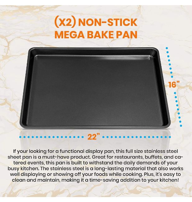 2 PIECE SET: Includes two mega bake pans (2 qt.) which measures (L x W x H) 21.9'' x 15.8'' x 1 '' -inches so you can make bulk batches of oven-baked cookies. Safe for kitchen ovens, countertop convection ovens, toaster oven