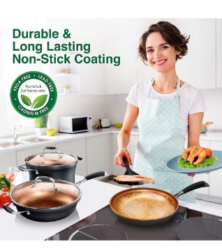 These pots and skillet fry pans are safe for use in gas, electric, ceramic & induction counters. Made of reinforced forged aluminum w/ coating thickness of multi-layered. Includes heat-resistant nylon silicone utensils. Basically, you can use them anywhere.