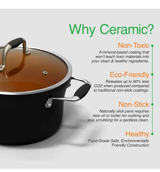 The ceramic cookware sets have 3 layers of copper with a hard-anodized and heat-resistant lacquer exterior. The solid cast iron design is sturdy and reliable, so you can use this scratch resistant pots for many years to come