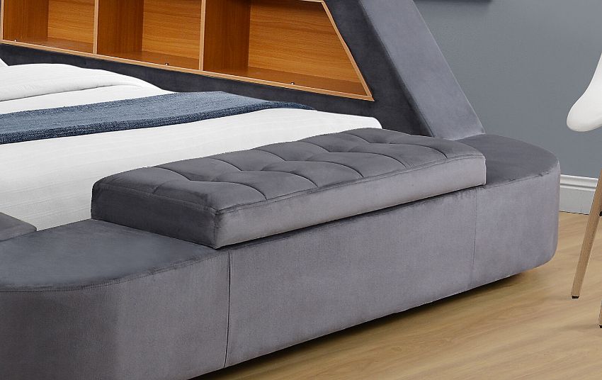 GREY PLUSH VELVET MULTI FUNCTION ALL-IN-1 PREMIUM LUXURY SMART BED with Massage Function, Bluetooth Speakers, Table, Light, Storage, Safe Cabinet etc