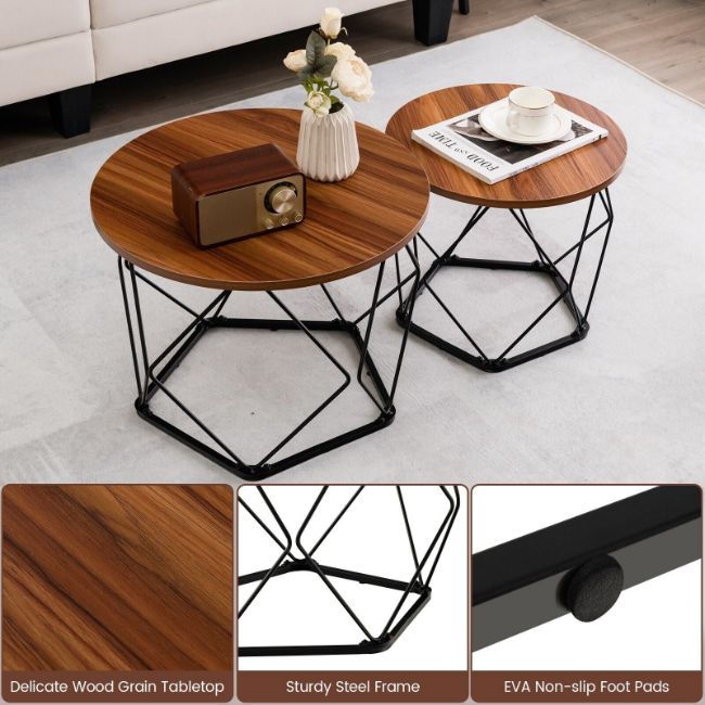 The coffee table set of 2 is a fashionable and practical addition to your home. The package includes 2 coffee tables of different sizes, allowing for individual or combined use. Each coffee table has a MDF tabletop and a pentagonal steel base. Both materials are durable for long-term use and sturdy for higher load capacity. More, under each coffee table, there is a roomy clearance where you can store sundries or cats can have a rest. Since EVA foot pads are offered, the floor won't be scratched. Overall, each coffee table looks very delicate with a circle tabletop and a staggered fencing frame.