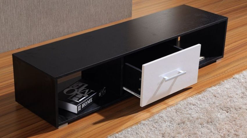 TV STAND HAS a Black wood effect frame with a high gloss White drawer front, PREMIUM Metal handle and drawer runners