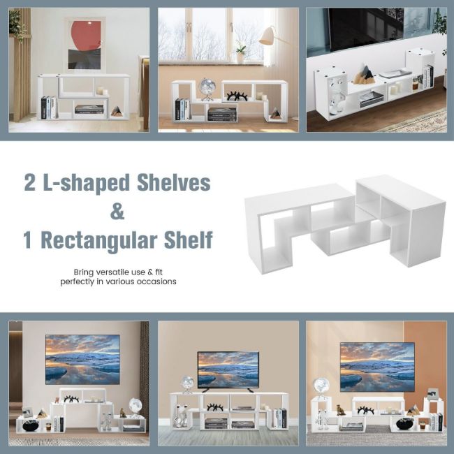 The unit features free combinations, among which the most common 3 styles have been shown in the pictures. As the 2 L-shaped shelves are stacked on the rectangular one, they can be expanded or rotated to meet different needs. Therefore, you can use it as a low TV console table, a corner storage cabinet or a standing display shelf. Besides, the 6 diverse compartments offer an orderly storage solution to different electronics, books and other ornaments. What’s more, the well-constructed shelves are rather sturdy and durable, and non-slip pads are also included for strengthened stability. By the way, the entertainment center has a clean and minimalist appearance, with the screw holes covered by stickers.