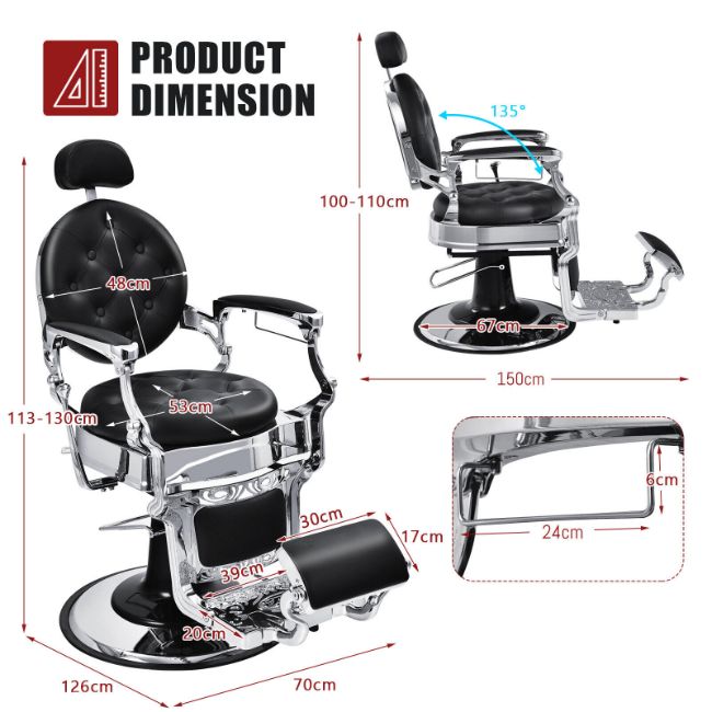 Vintage barber chair with an elegant and luxurious appearance would not only be an attractive decoration to your workplace but also bring more convenience for hair stylists or beauty artists at work. Our hairdressing chair is filled with high-density sponges and covered with premium PVC leather, which is breathable, comfortable, and easy to clean. Moreover, supported by a heavy-duty aluminum alloy frame as well as a solid steel base, the chair is characterized by excellent stability and durability, and through the electroplating process, the metal frame is anti-rust and glossy with a long lifespan. Other than that, the height can be adjusted from 113cm to 130cm by lowering or raising the foot bar catering to people of different heights. It can also be rotated 360° and locked by the heavy-duty hydraulic pump. Besides, you can recline the backrest up to 135° and adjust the headrest to 7 positions to provide your customers with hairdressing or other services at a precise position. The headrest can also be fully removed and stored on the side metal ring when not in use. With the step-by-step instructions, you can assemble it easily by yourself.
