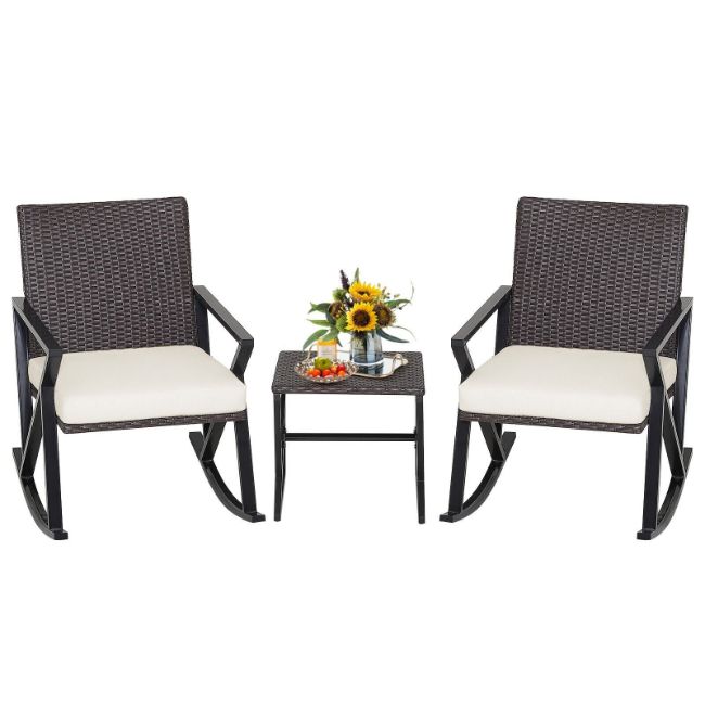 This 3-piece patio rocking chair table set will make you more comfortable and relaxed in leisure time. The ergonomic seat with soft cushion offers you endless comfort to sit. And you can rock back and forth with high stability and safety, as the rocking base is solid enough. What's more, the coffee table is compact yet functional, allowing you to easily fetch the drinks or snacks. And it's also of high stability with the additional PP board under the tabletop. The foot-pads of table are adjustable, making it stand more stably even on the ground which is not flat. Last but not least, both the rustproof metal frame and durable hand-woven PE rattan enable the whole set to accompany you for a long-lasting time.