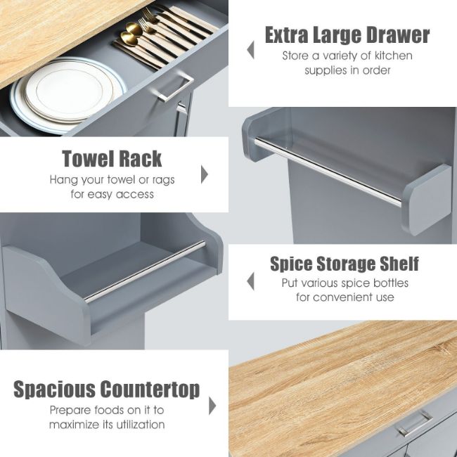 Featuring a spacious countertop, a large drawer and a cabinet, this trolley cart will offer ample storage space for tableware, glasses, food, etc. The shelf inside the cabinet can be adjusted with 3 positions, which allow you to customize the spacing of the shelves according to the storage items. And specially designed spice rack and towel rack make it easy for taking the towel and spice bottles at any time. Equipped with 4 universal casters (2 with brakes), it achieves a perfect balance between convenient mobility and high security. Whether you want an extra working surface, or to better organize your kitchen supplies, our kitchen island cart is your ideal choice.