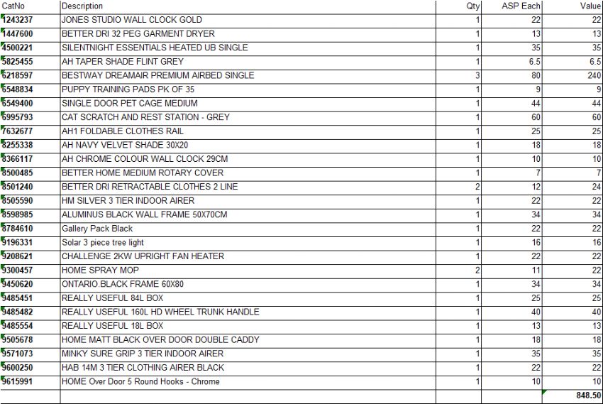 EAMA have received these directly from Argos so you can rest assured that nothing has ben removed from the pallets prior to listing them - EAMA have over 300 pallets in stock and therefore a pallet will be chosen at random from the homeware category.