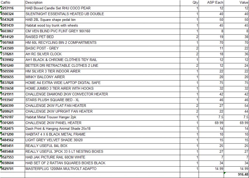 EAMA have received these directly from Argos so you can rest assured that nothing has ben removed from the pallets prior to listing them - EAMA have over 300 pallets in stock and therefore a pallet will be chosen at random from the homeware category.