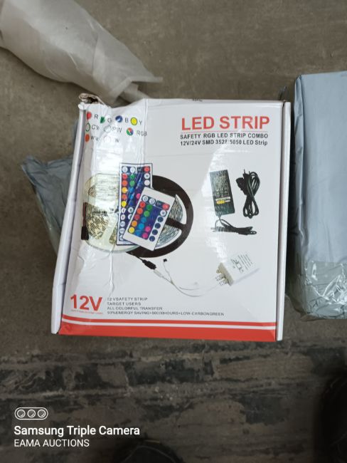 6 led strip lights, 20 mobility sofa lap tables, 36 what appears to be security lighting, 2 chain saws, 4 boxes of wagon rachet straps, 1 small buffet, 20 multi setting shower heads, 3 boxes Containing a total of 30 wireless keyboards with mouse