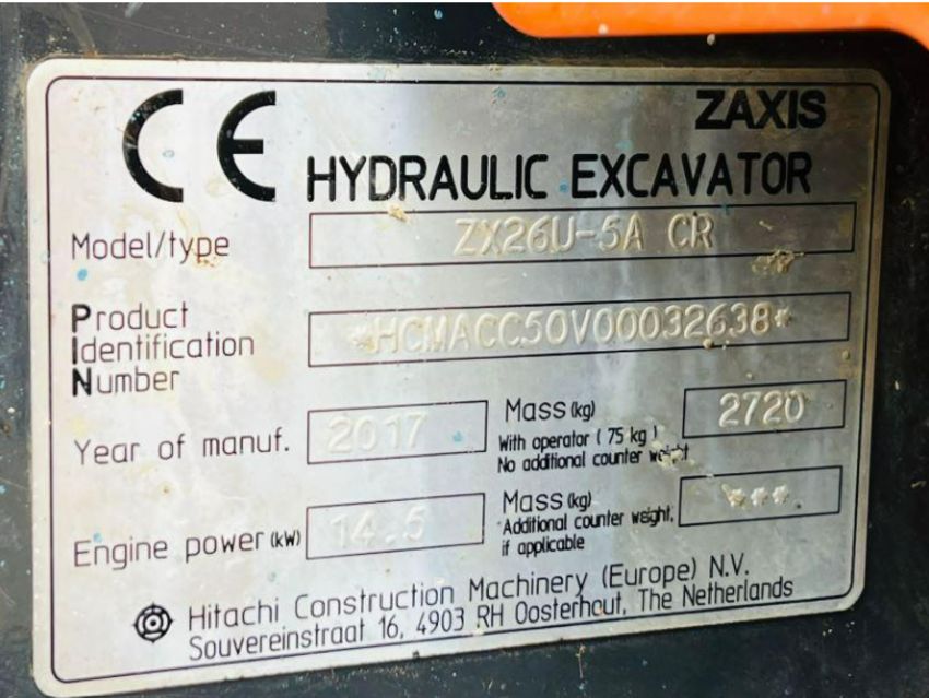HITACHI ZAXIS ZX26U-6A EXCAVATOR * YEAR 2017 , 2524 HOURS * C/W RUBBER TRACKS