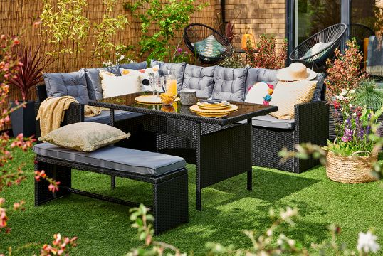 Consists of an L-shaped corner sofa and a bench, offering ample seating for your garden parties.