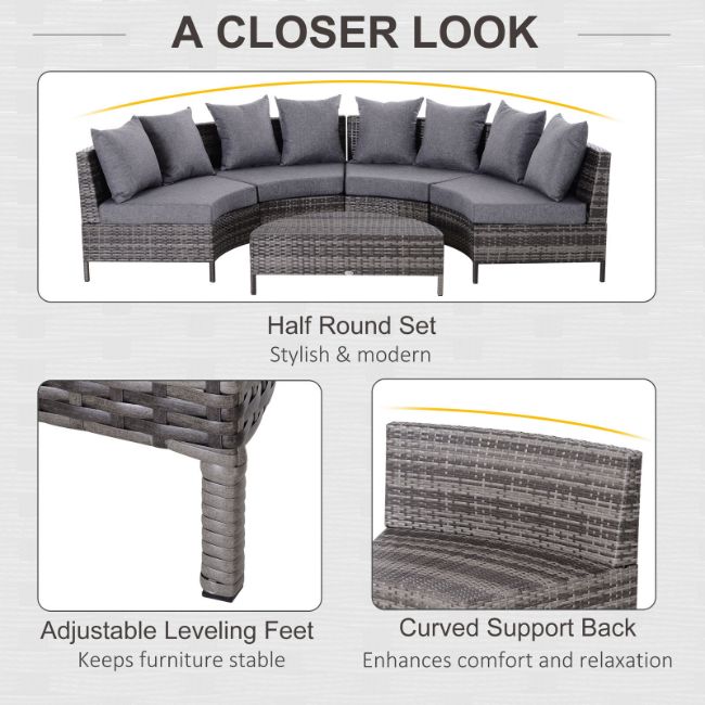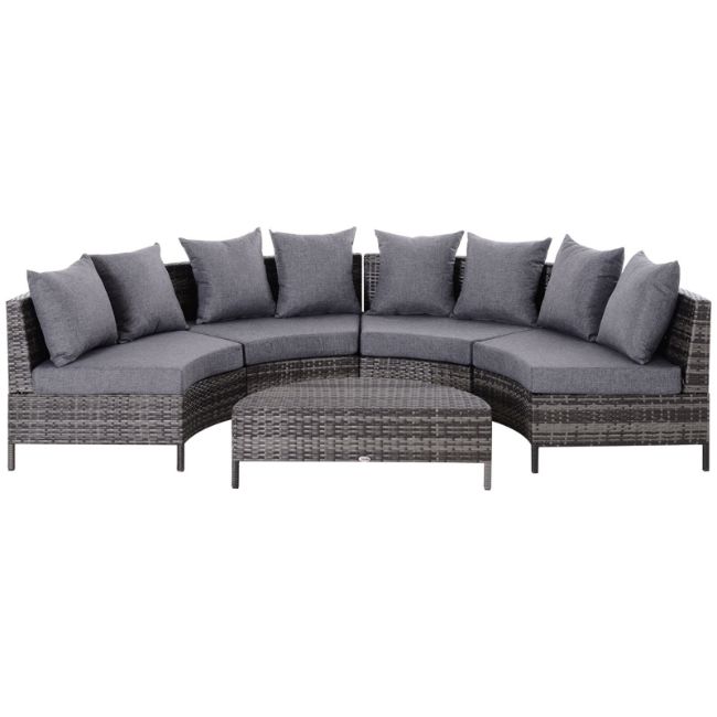 - Makes those special times spent with friends in your garden better than ever before, thanks to this five-piece garden sofa set from Outsunny. Using hand-woven PE rattan. Curved in shape for a more intimate and cosy feeling, each seat of the conservatory furniture is with a thick foam seat cushion with a washable cover to ensure you can lounge comfortably, with back cushions for support. Finished with legs for balance and a matching coffee table. Effortless style whilst you sit under the sun.