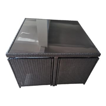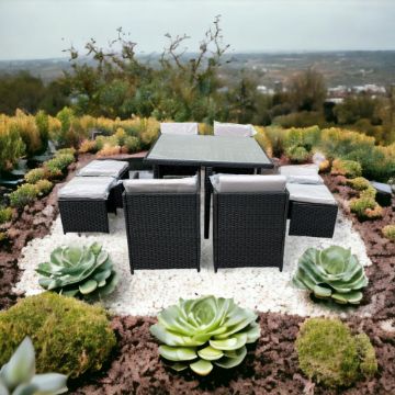 Introducing the 9PC Cube Rattan 8 Seater Garden Set, perfect for enjoying your outdoor space in comfort and style. The set includes 4 comfortable chairs and 4 stools with  practical table with a tempered glass top. The chairs are made with a high-quality, weather-resistant rattan material that is both durable and easy to clean, while the cushions are made with a water-resistant fabric that is perfect for outdoor use. The chairs can be neatly tucked away under the table to save space, making this set ideal for smaller gardens or patios.