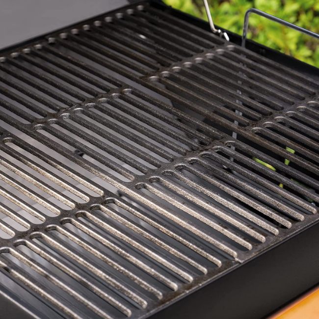 - Cast iron cooking surface with liftable sections to allow easy access to coals plus warming rack