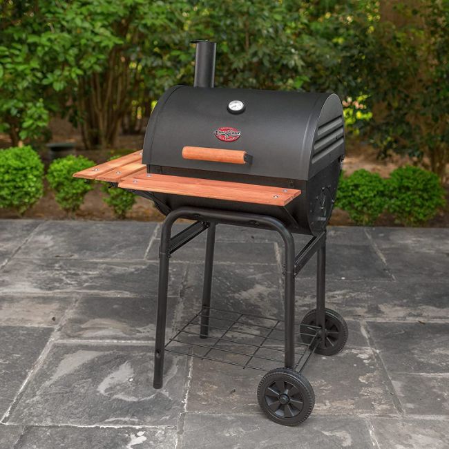 This Char-Griller Wrangler Barbecue is a great all-rounder with metal shelves, temperature gauge and smoke stack/chimney.