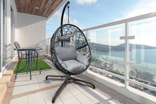Consists of a sturdy steel frame and hanging egg seat with a cushion and pillow.
